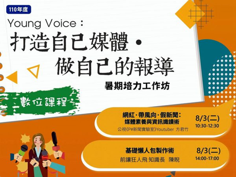 臺北市青少年發展處首次採用數位線上課程辦理110年度「Young Voice:打造自己的媒體‧做自己的報導」暑期培力工作坊,讓你有機會在線上與知名講師互動學習,活動期間為110年8月3日至8月5日,並於6月3日至7月5日開放線上報名,名額有限,不容錯過。