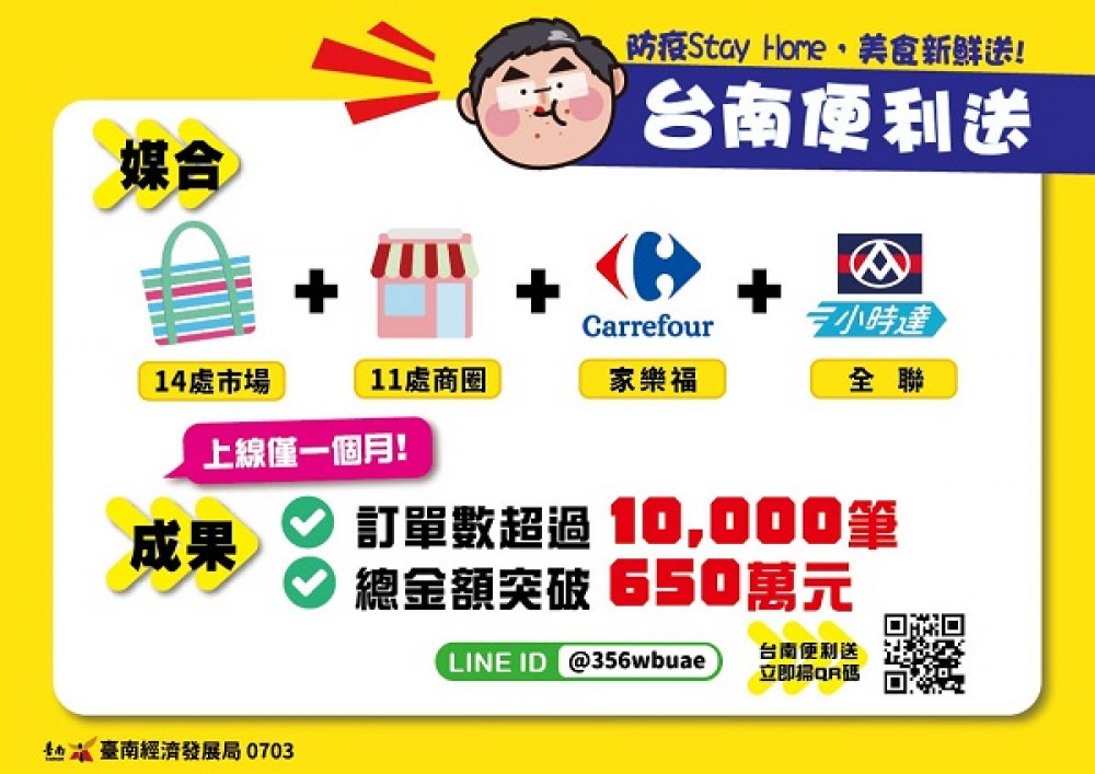經發局指出,台南便利送媒合14處市場、11處商圈、加上家樂福與全聯生鮮超市,結合在地代客跑腿業者台南小短腿、並兼顧小黃計程車的生計,合作串起防疫時期外送商機,成果相當可觀。