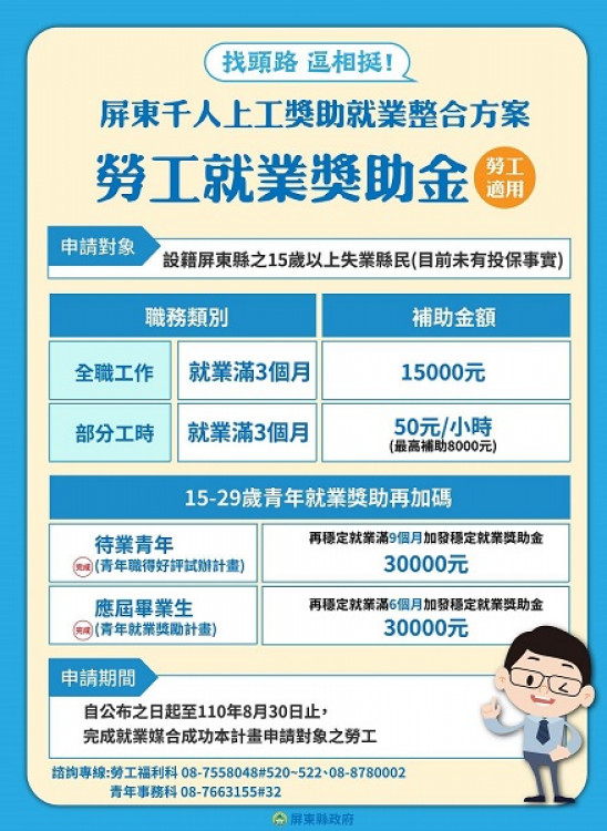 只要經由屏東縣政府就業服務台媒合,參與計畫企業的職缺者,穩定就業三個月,即給予就業獎助金,屏縣提供1,000個工作機會,設籍屏東縣的勞工只要參加就業方案滿三個月,全職工作者可領1萬5千元獎助金,部分工時每小時補助50元,最高可領8,000元獎助金。