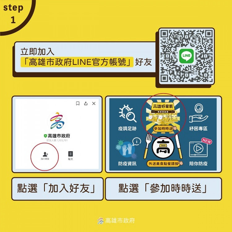 高市府呼籲,民眾手刀拿起手機,打開「高雄市政府LINE官方帳號」進行資料登錄,越早登錄機會越大!登錄操作步驟如下:1.首先加入「高雄市政府LINE官方帳號」好友;2.在對話框點擊置底圖文選單「高雄好家載時時送」;3.點選所在地區、個人資料並填寫身分證字號;4.完成後送出即可參加活動。
