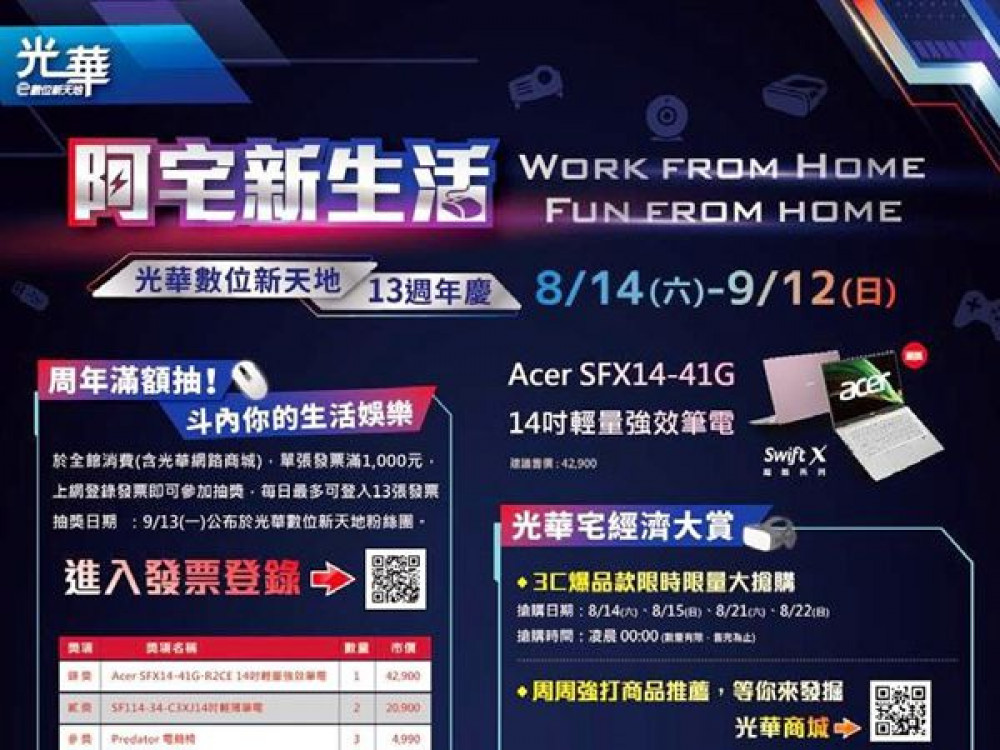光華周年慶期間,來光華全館消費單張發票滿1000元,上網登錄發票即可參加抽獎,每日最多可登入13張發票,於9月13日抽出幸運得主,最大獎為價值42900元的Acer SFX14-41G-R2CE 14吋輕量強效筆電,來光華線上線下歡樂購,好康享不盡。