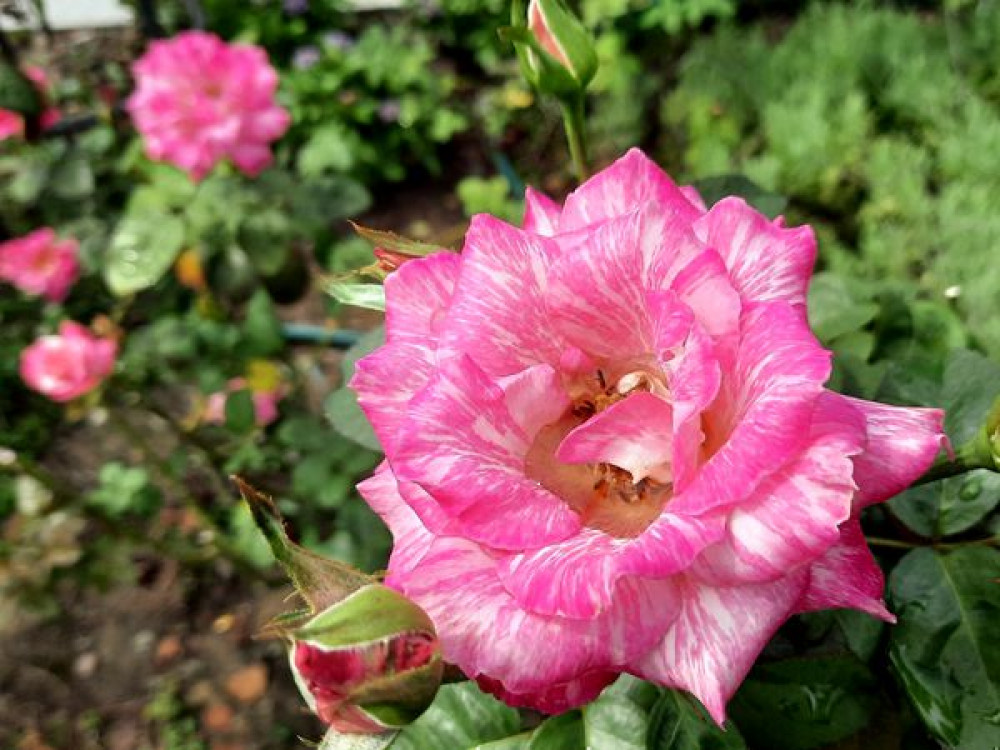 踏進五彩玫瑰園入口,很容易就能找到具有濃郁香氣的粉妝樓,在烈日下花朵顯得小巧白皙,花瓣數非常多,屬強健多花,也是中國最古老的玫瑰品種。旁邊栽種同屬強健多花、具濃香的大花月季,貴氣的暗紅色花瓣還可做為果醬使用,也適合做大範圍庭院美化植栽;臺灣本土培育現代大花玫瑰「奇蹟」的花瓣為桃紅白色絞紋,高心杯狀花型,為巴龍洛察在臺灣的芽變品種,開花持久帶有強香,初學者易上手也屬臺灣人氣品種。