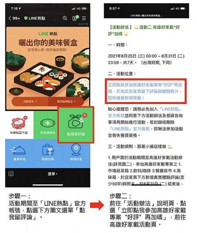 高雄好家載送LINE POINTS 100點。高雄市政府與LINE熱點聯手合作的「高雄好家載」活動期間,LINE熱點推出「高雄好家載“好評”加碼」活動,8/25至8/31只要在好家載限定店家頁面,填寫評論並分享照片,就有機會獲LINE POINTS 100點,快動手指當美食評論家。