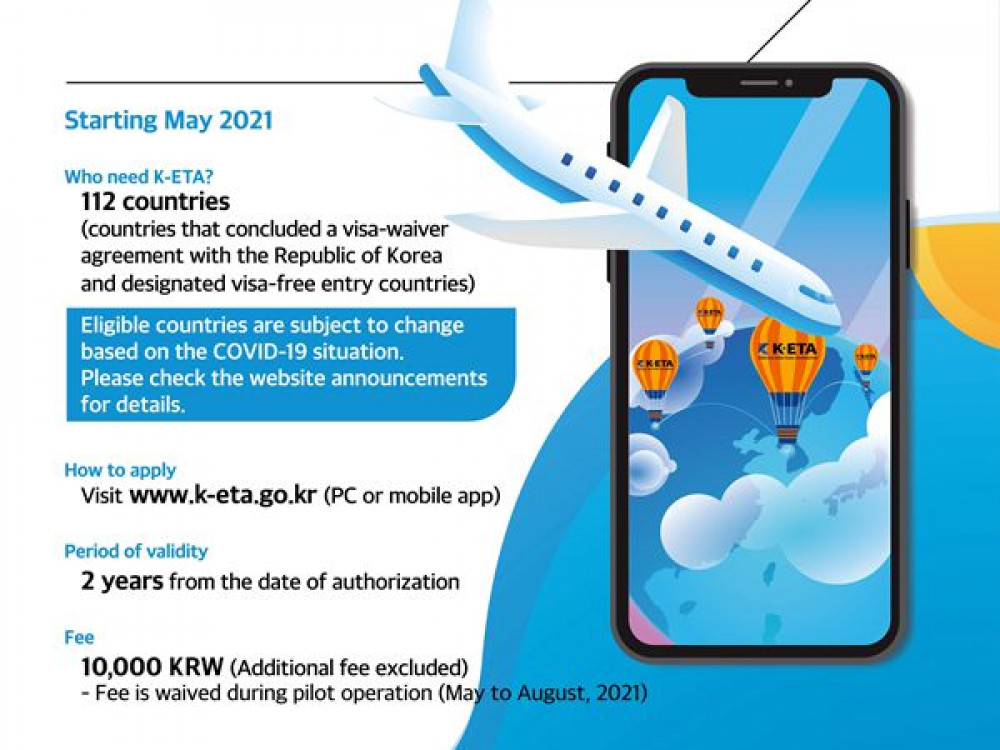 韓國政府將從9月1日起,以112國的國民為對象,義務性地實施電子旅遊許可制(K-ETA),免簽入境韓國的國家國民,在出發前必須事先取得K-ETA,才能在機場櫃檯進行登機手續並領取前往韓國的機票。